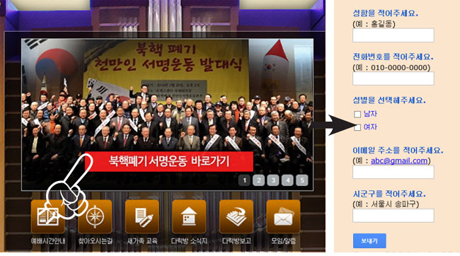 지난 2월 29일 『북핵 폐기 천만인 서명운동』본부가 발대식을 갖고 북핵 폐기를 위한 천만 명 서명운동이 시작된 가운데 우리교회는 지난주부터 이 운동에 동참했다.