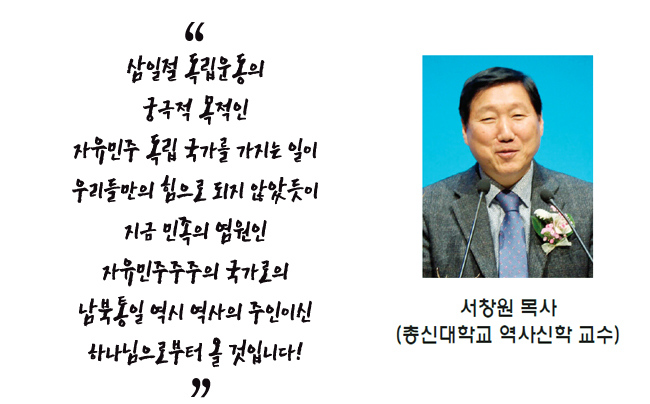 그들의 헌신과 외세의 힘을 통해 그토록 갈망하던 조선의 독립을 쟁취하였으나 그 감격의 열기는 오래가지 못했습니다. 또 다시 남북이 이념으로 분리되어 한국전쟁이라는 비극을 낳았습니다. 그때도 유엔 연합군의 도움으로 자유대한민국을 지켜낼 수 있었습니다. 그 이후로 적대국으로 주적의 얼굴을 맞대고 으르렁거리고 있는지도 어언 70년이라는 세월이 다 되어갑니다. 삼일절 독립운동의 궁극적 목적인 자유민주독립국가를 가지는 일이 우리들만의 힘으로 되지 않았듯이 지금 민족의 염원인 자유민주주의 국가로의 남북통일 역시 역사의 주인이신 하나님으로부터 올 것입니다. 그 일을 위해서 매일 눈물로 기도합니다.