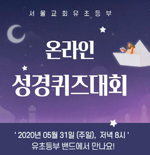 코로나 19 사태의 장기화로 교회 내에서 주일학교 교육이 어려워짐에 따라 우리 교회는 새로운 교육방식을 여러 방면으로 시도하고 있다. 그 일환으로 오늘 유·초등부에서는 온라인 성경퀴즈대회를 개최한다.