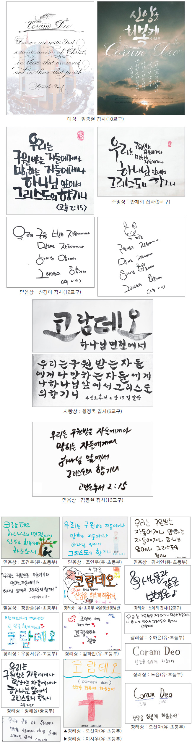 지난 한 달간 진행한 순례자 주최 : 사명자대회 주제 및 성구 캘리그라피 공모전이 지난주에 마감하였습니다. 모두 68점의 작품이 응모하였고 지난 11월 15일(주) 편집위원들의 심사가 있었으며 결과는 5, 6면을 참조하시기 바랍니다. 그리고 오늘 1층 로비에서 전시가 있을 예정이며 이번 수상작 중 몇몇의 단어들은 수상자의 이름을 딴 디지털캘리그라피폰트로 제작하여 교회내 행사에서 사용할 예정입니다. 디지털캘리그라피폰트는 추후에 다시 순례자를 통해 발표할 예정이며 응모해 주신 모든 성도님들께 다시한번 감사드립니다. (편집부)