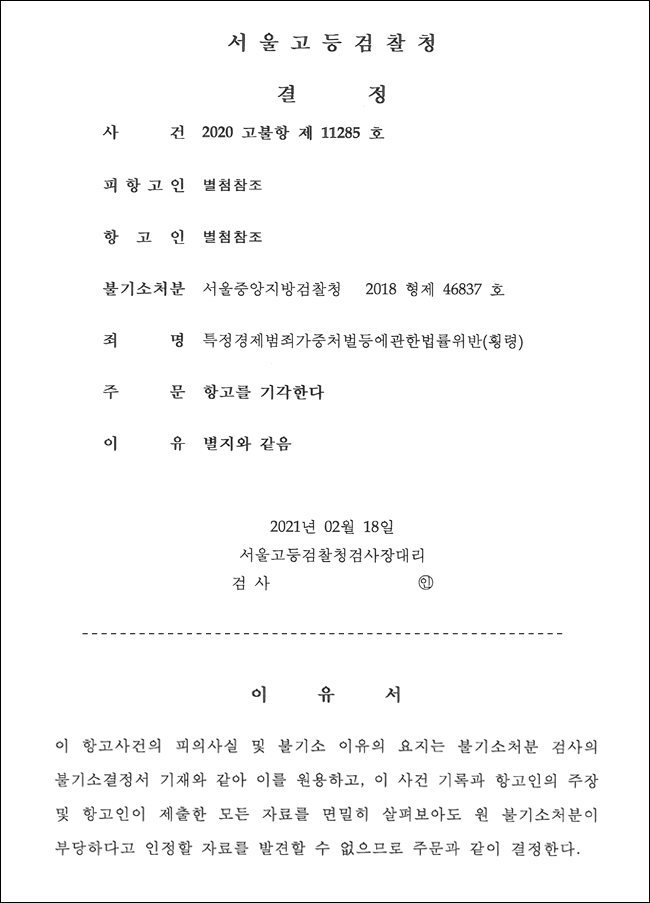 이후 서울중앙지방검찰청 역시 송치 후 1년 7개월여의 수사 끝에 2020년 9월 14일(월) 피고발인 전원에 대하여 경찰 의견대로‘혐의 없음’ 처분을 하였다.