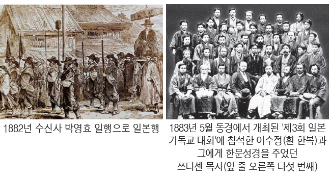 1882년 이수정은 제3차 수신사의 박영효 일행으로 일본으로 건너간다. 일본의 농업정책에 제일 큰 관심을 가진 이수정은 일전에 일본에 다녀온 선배 안종수의 주선으로 농학박사이자 일본의 대표적인 기독교 지도자인 쯔다센의 집을 방문하게 된다. 그는 광대한 농장을 운영하고 있었으며, 일본이 근대화되려면 속히 기독교를 수용해야 한다고 외쳤던 인물이었다. 이날 선물로 받은 한문성경을 탐독하면서 회심에 이르고 복음을 받아들여, 1883년 4월 29일 동경의 노월정교회에서 세례를 받았다.