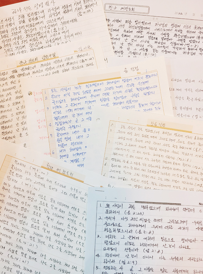 단톡에 올라온 성구 말씀을 읽고 또 읽고 안 보고도 외우기도 했지만 돌아서면 잊어버리는 나이를 감안하여 첫 월례회 때는 암송 말씀 중 빈칸 채워 써넣기로 했는데 열심히 집중해서 필기시험에 혼신을 다하시는 권사님들의 뒷모습이 마치 수능 시험장처럼 진지했습니다. 그리고 최근에는 암송 구절을 세 번씩 써서 제출하기로 했는데 캐나다에 출타 중이신 권사님을 포함하여 한나 전도회 권사님 대부분이 제출을 하시는 열심을 보이셨습니다.