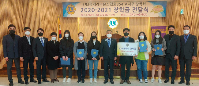 국제라이온스협회 354-A지구(총재 김경수)는 지난 3월 3일(수) 호산나대학 제16회 입학식을 통해 경제적 어려움을 겪고 있는 발달장애인 10명의 학생에게 각 100만 원씩 1,000만원의 장학금을 전달했다. 국제라이온스협회 354-A지구 김경수 총재는 사전 장학금 전달식을 통해 “발달장애를 가진 학생들 중 코로나19로 힘든 상황에서도 배움의 끈을 놓지 않고 꿈을 위해 도전하는 청춘을 응원한다”고 말했다. 호산나대학은 국제라이온스협회 354-A지구와 2018년부터 “드림장학금 기탁 양해각서”를 통해 상호간 업무협약을 맺고 코로나19 장기화로 가정 형편이 어려운 발달장애인 대학생들에게 장학금을 지급하고 있다. 호산나대학 이동귀 부학장은 “매년 장학금을 지원해 준 국제라이온스협회 354-A지구 김경수 총재님께 감사를 드린다”고 소감을 전했다. 한편 “받기만하는 사람에서 나누는 사람이 되길 바라며, 자신감과 자존감을 회복하여 따뜻한 심성을 갖는 호산나인이 되길 바란다”라고 했다.